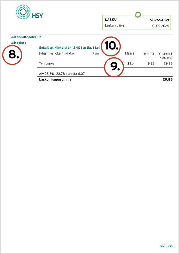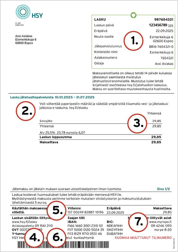 Voit tutustua jätelaskun sisältöön lukuohjeen avulla. Syyskuusta 2025 alkaen HSY:n laskut eivät enää sisällä perinteistä tilisiirto-osiota. Kaikki tarvittavat tiedot laskun maksamiseen löytyvät jatkossakin laskusta.